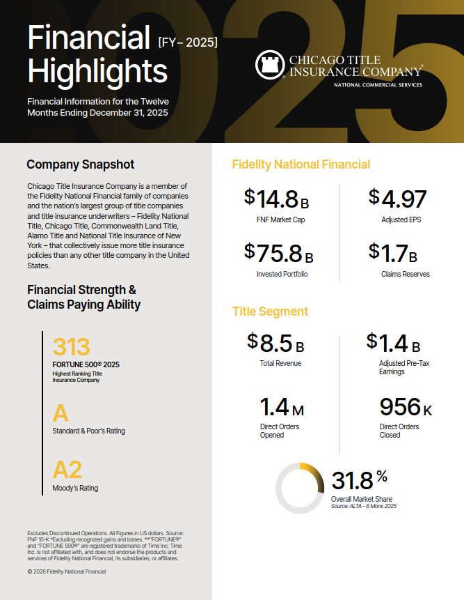 Since Chicago Title Commercial is a direct operation of Chicago Title Insurance Company, you have the peace of mind of funding DIRECTLY through Chicago Title Insurance Company, a Fidelity National Financial Company (FNF). FNF has a Standard and Poor’s rating of A and title group claims reserves of $1.7 Billion as of the 2025 year end. In addition, we’d like to provide you with our 2025 company fact sheet.